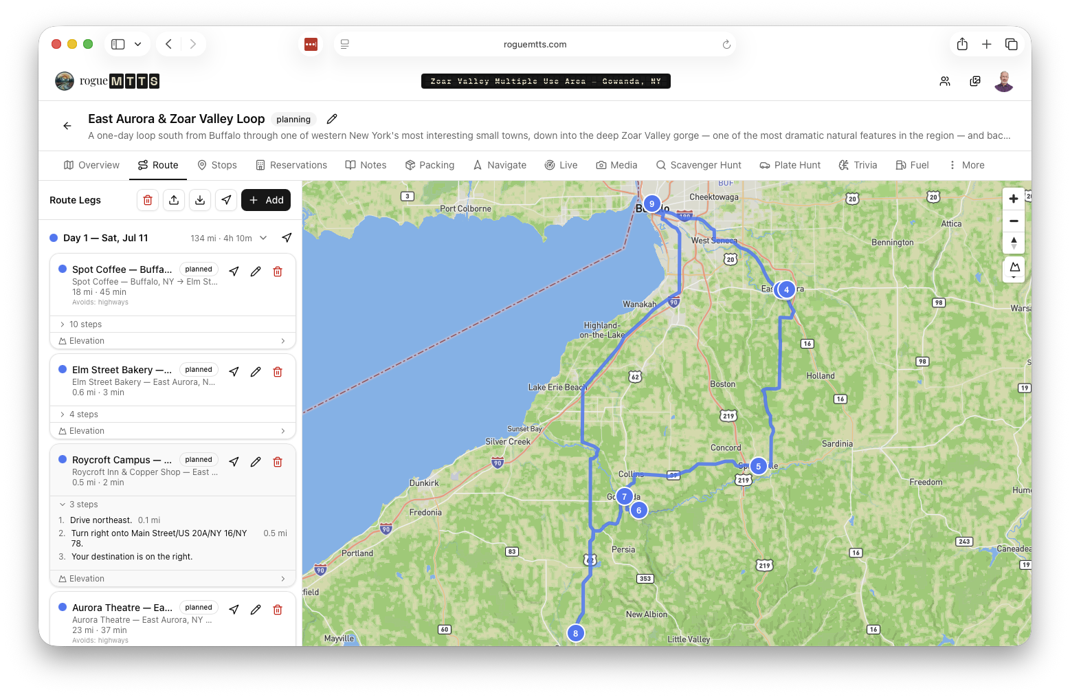 Add legs day-by-day, pin stops and points of interest, set up scavenger hunts and trivia, and manage reservations and packing lists.